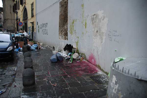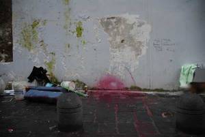 Hanno tolto l’amianto da piazza Sanità. Stamattina le buste erano state spostate più verso il cancello della Basilica, forse dagli spazzini che ieri avevano rimosso i rifiuti. Il nostro povero cartello ridotto in carta stracci dalla pioggia.