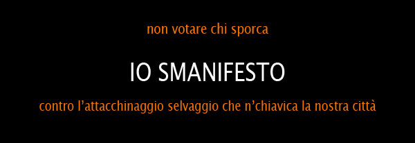 Se lo spazio per mettere i tabelloni non é sufficiente bisogna andare a protestare al comune , non sporcare muri e i palazzi! Se i tabelloni sono 5 o 10 o 20 non importa!Ma i manifesti si devono mettere SOLO SUI TABELLONI!!! E poi anche questi individui che si vogliono fare eleggere, dovrebbero dire a quelli che lavorano per loro di NON attaccare questi manifesti dovunque…Se attacchi sul palazzo storico, io non ti do' i soldi!Le 1000 euro, non le guadagni!! Primo,perché hai sporcato, secondo perché hai violato la legge contro l'attacchinaggio abusivo e terzo (ma non meno importante) perché mi hai fatto fare una figura di Me…