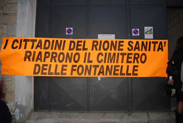 Tutto in gran segreto, riunione, organizzazione, proposte e in seguito, azione. La rete Sanità, la Paranza, padre Alex Zanotelli, Insurgencia, don Antonio Loffredo, il blog del rione sanità. Atto inaspettato, deciso a ridare al rione l’ossario delle Fontanelle chiuso da circa 15 anni. Dai “bassifondi” di Napoli partono azioni di civiltà e di partecipazione, il rione ancora una volta in prima fila per la riappropriazione della cosa pubblica, come atto dimostrativo, come atto che scardina le incoerenze e le perplessità.