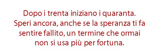 Dopo in quaranta iniziano i cinquanta. Per fortuna che mia moglie lavora! Per fortuna che mio suocero ha qualcosa di soldi! Ormai non ci speri più. Le tue competenze e la tua età sono obsolete. Intanto hai finito di sperare in un sms che arriva, in una mail, in un amico, in una raccomandazione. Per tent’anni hai “sorpassato” fallendo, infondo volevi guadagnare solo 1000 euro al mese con un po’ di contributi. Ti lasci penetrare dal fato. Guardi le nuvole che sono di un colore indefinito: le vedi bianche, grigie, argento, rosa, le vedi dello stesso colore del tuo curriculum che nonostante tutto porti ancora con te.