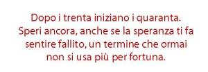 Dopo i trenta iniziano i quaranta. Speri ancora, anche se la speranza ti fa sentire fallito, un termine che ormai non si usa più per fortuna. Vagheggi. “Mi scusi, ma sono un laureato, lei mi offre un posto come garagista? Con tutto il rispetto per questo lavoro… ma per quanto tempo?” Accetti! Finiscono, un po’ per la depressione un po’ perché non c’è lavoro, anche queste piccole attività, finiscono quelle 600/700 euro al mese, finisce la depressione che lascia il posto all’apatia. Dovevo andarmene all’estero, fuggire e provare a sfondare nel mio campo.