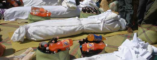 Alla fine della cerimonia, tutti i presenti fanno la “corsa” agli oggetti che sono entrati in contatto con le ossa asciutte durante la cerimonia: bare, stuoie e tende diventato oggetto di una impetuosa battaglia e ogni piccolo frammento viene portato a casa. [fonte: africareview.com – traduzione di s.d.m.]