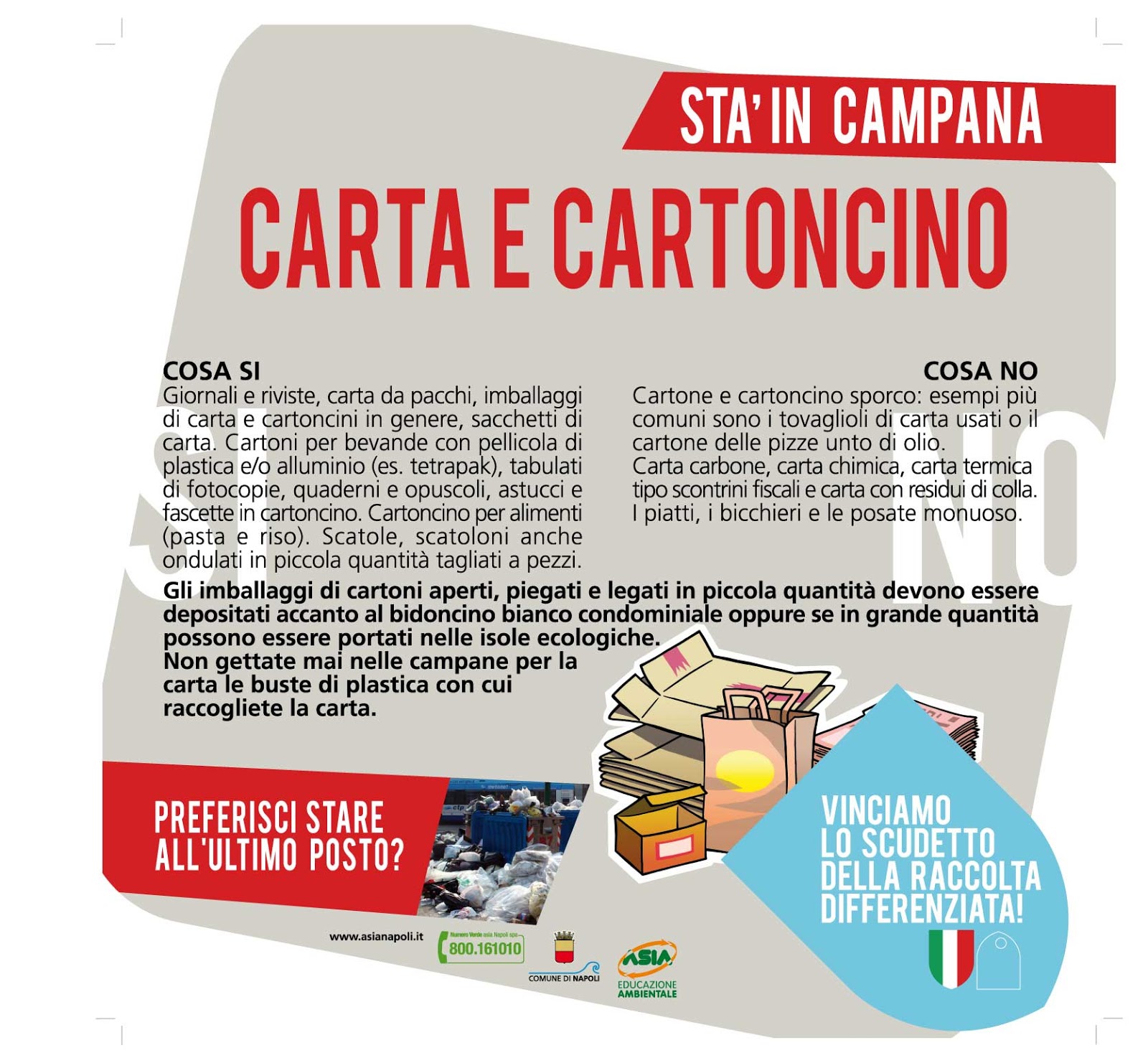 Mettere in pratica le buone maniere da parte di tutti compresi gli operatori ecologici, e i 4 scugnizzi che si vedono girare per il quartiere. Bisogna strillare nelle orecchie dei genitori perchè sono loro che devono dare l'insegnamento. L'altra sera uno di questi ragazzini con il consenso della sua banda, stava cercando di rimuovere cosi solo per divertimento, forse perchè era “ammirato” da qualche ragazzina, il riponi abiti e panni che ha istallato l'ASIA.