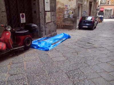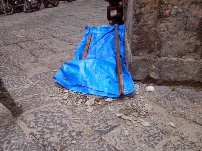 Amianto sbriciolato (pericolosissimo), alla via s. m. Antesaecula 126 altezza via Arena alla Sanità di fronte alla pizzeria Concettina ai Tre Santi. L’amianto è coperto in modo insufficiente da un telone e da una busta vicino sede di Celanapoli.
