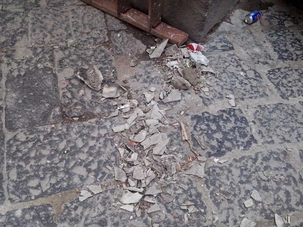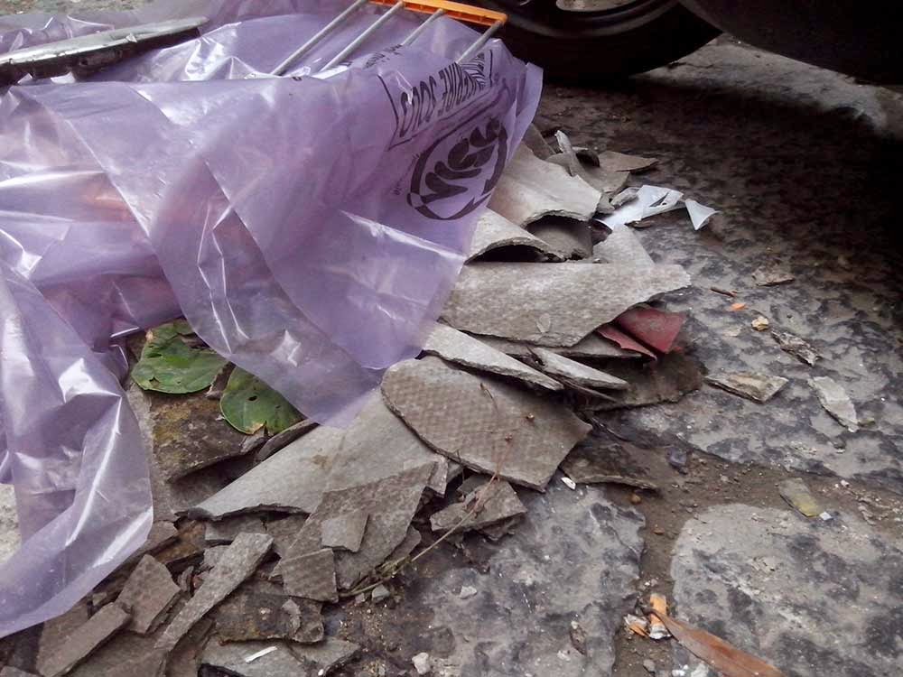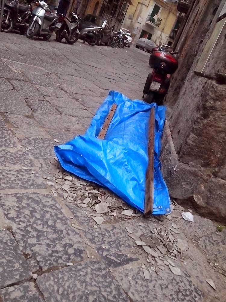 Amianto sbriciolato (pericolosissimo), alla via s. m. Antesaecula 126 altezza via Arena alla Sanità di fronte alla pizzeria Concettina ai Tre Santi. L’amianto è coperto in modo insufficiente da un telone e da una busta vicino sede di Celanapoli.